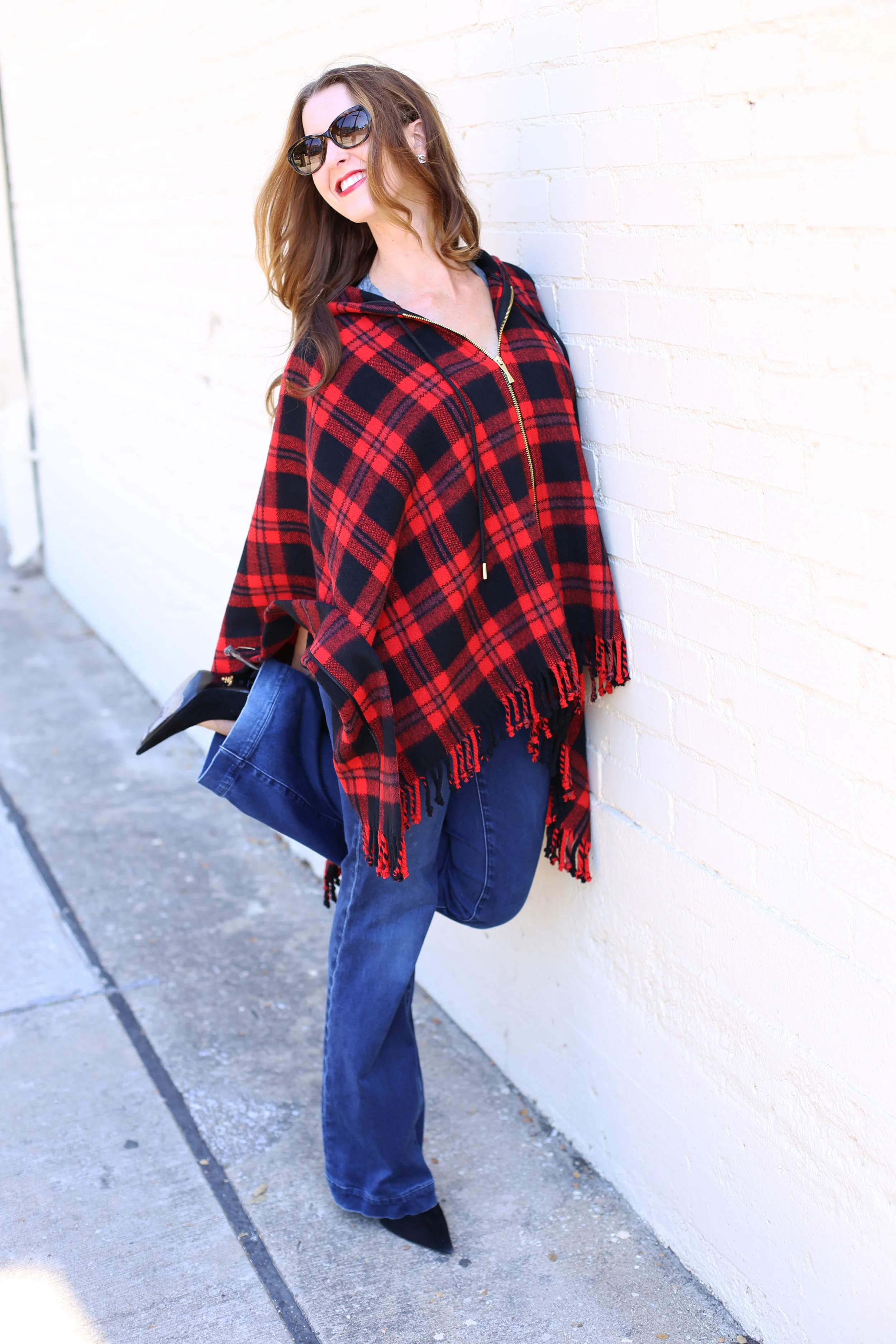 This piece made me so happy. I mean you give me fringe and plaid together and I'm going to smile...big! Ponchos are the perfect excuse to wrap up all warm and cozy. Think basically like you're wearing a fashionable blanket and getting away with it! Football games, evening strolls, casual dinners out, afternoon shopping, all perfect places to pull out your poncho. I wear mine one of two ways depending on my mood and where I'm going. Option 1. My wide leg jeans, a black pointed toe heel, and a solid black tank under. This look is my dressier option if you will. Option 2. I put on my black or dark denim ripped skinny jean (or no rips), my black booties and a white or black tee under. Remember the poncho is meant to be the main look of the outfit, not taken off like a coat. Otherwise you're now mad at me and freezing cold in a tee shirt!